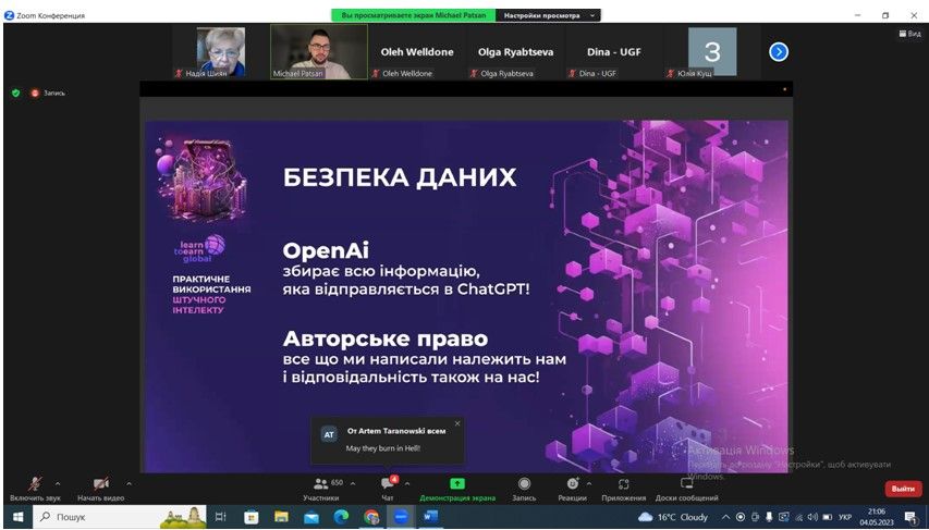 4 травня 2023 р. викладачі кафедри хімії та методики викладання хімії взяли участь у роботі воркшопу «Практика використання штучного інтелекту», який провів відомий інвестор, підприємець, експерт з питань міжнародних фінансових ринків і криптовалют, фінансовий радник засновника Web3-університету професій майбутнього «Learn to Earn Global», засновника блокчейн-платформи «Amsets» Михайло Пацан. У рамках воркшопу розглядалися питання про застосування штучного інтелекту в різних сферах, а також про популярні ШІ, серед яких є нейромережі, такі як ChatGPT, MidJourney, Dall-E 2, Whisper та інші.