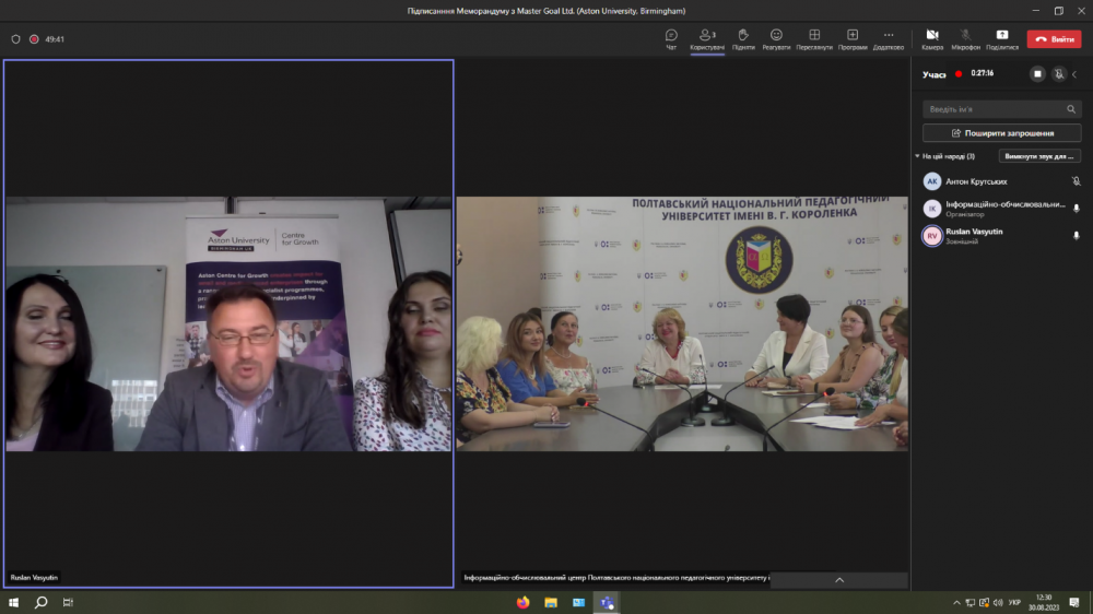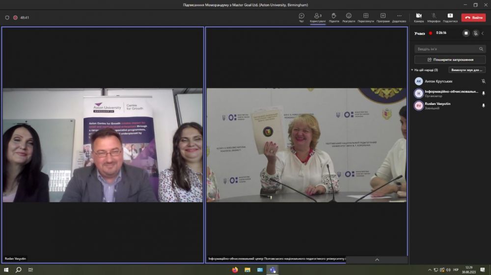 30 серпня 2023 р. Полтавський національний педагогічний університет імені В. Г. Короленка і британська консалтингова компанія Master Goal Ltd, офіційний партнер Aston Centre for Growth (Aston University, Birmingham), підписали угоду про міжнародну співпрацю. Угода передбачає обмін науковою інформацією, навчальними та методичними матеріалами, публікаціями, спеціальними комп’ютерними програмами, проведення спільних конференцій, семінарів, практикумів, підвищення кваліфікації, стажування педагогічних і науково-педагогічних працівників, реалізацію програм зі мобільності студентів та викладачів.