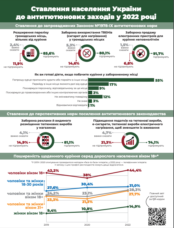 Більшість респондентів підтримують заходи для запобігання початку куріння серед дітей та молоді, передбачені ухваленим Законом №1978-ІХ: 78% — заборону продажу сигарет та тютюну з ароматичними добавками; 76% — заборону продажу рідин для електронних сигарет з добавками; 79% — заборону реклами пристроїв для нагрівання тютюну. Дев’ять з 10 жителів України (92%) підтримують запроваджену раніше заборону продажу неповнолітнім пристроїв для нагрівання тютюну, електронних сигарет та рідин до них.